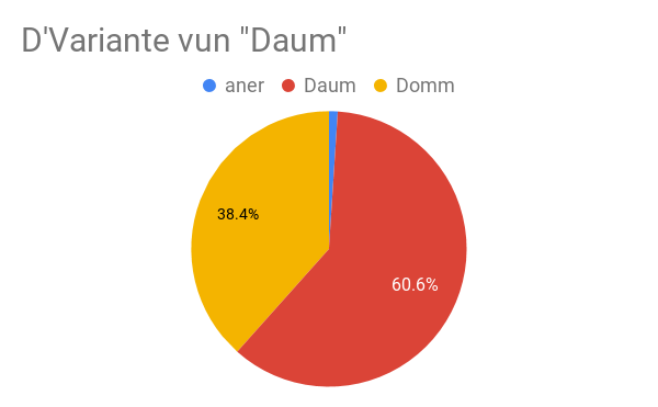 Am heefegste gouf mat 60% (295) d’Variant Daum genannt, op déi zweet Plaz kënnt mat 38% (187) Domm. Mat e puer Nennunge sinn dann och nach Daumen, Dëmmchen, Deimerling dobäi, déi am Kéisdiagramm ënner „aner“ klasséiert sinn.