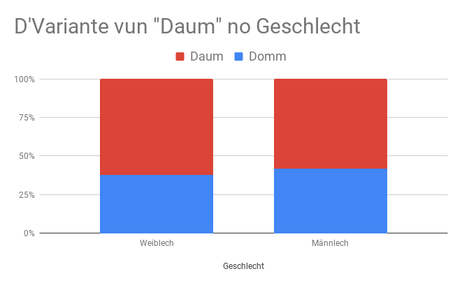 Ob de Gebrauch vun enger Variant geschlechtsspezifesch ass, kucke mer eis als nächst un. Wéi dem Diagramm ze enthuelen ass, ass d’Verdeelung tëschent Fraen a Männer zimmlech konstant. A béide Fäll läit d’Prioritéit bei der Variant Daum, woubäi d’Männer eng liicht Tendenz zum Domm opweisen, am Géigesaz zu de Fraen.