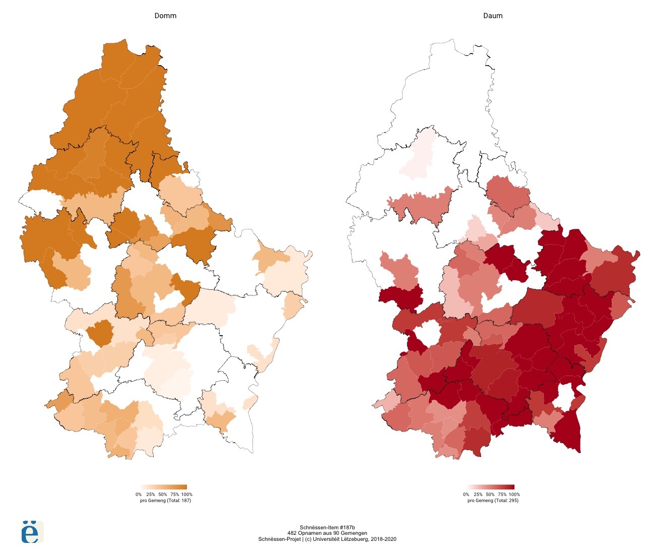 D’Kaart stellt da schliisslech de Gebrauch vun de béiden Haaptvarianten no Dialektgebitt duer. Déi regional Verdeelung weist eis, dass d’Variant Daum am ganze Guttland dominéiert. Am Norde vum Land huet den Domm ganz kloer d’Iwwerhand. Si kënnt awer, wann och méi seelen, och am an der Mëtt an am Süde vu Lëtzebuerg vir. Am Oste vum Grand-Duché allerdéngs ass den Domm esou gutt wéi net present. Hei gesäit ee ganz kloer, dass Tendenz beim Daum läit.