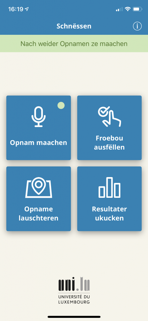 Fir Deel vum Projet ze ginn an d’Fuerschung iwwert d’Lëtzebuergescht ze ënnerstëtzen, musst Dir Iech d’App just an de bekannten App-Storen eroflueden. Nodeems dir e puer Froen zu Ärer Persoun beäntwert hutt, kann et och scho lassgoen. Dir hutt dann d’Méiglechkeet Opnamen ze maachen, Froebéi auszefëllen, schonn enregistréiert Opnamen aus dem ganze Land ze lauschteren oder Iech an der Resultaterubrik duerch d’Auswäertungen ze klicken.