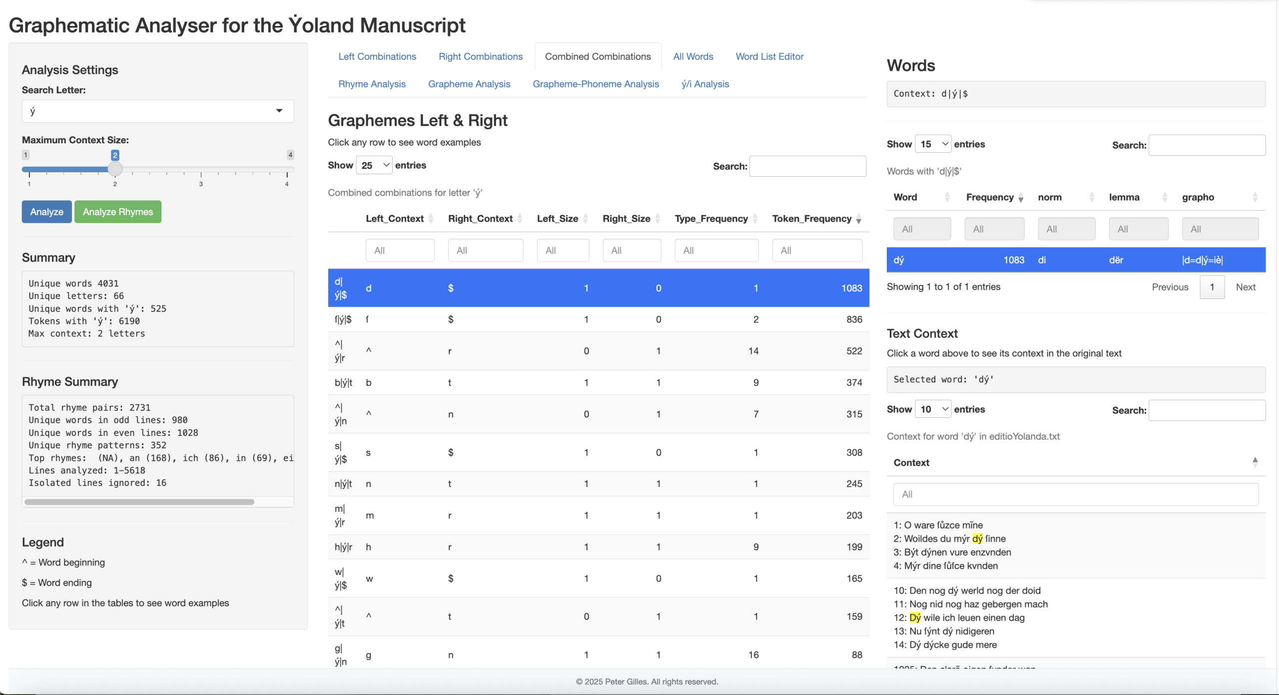 Hinweisen möchte ich jedoch in diesem Beitrag auf eine Werkzeug, dass ich für diese Analyse entwickelt habe. Um aus dem variationsreichen mhd. Text phonologische Strukturen zu rekonstruieren, ist eine vorsichtige Interpretation der graphematischen Struktur erforderlich. Textgrundlage dazu ist die graphemgetreue Transkription, die Claudine Moulin 2009 vorgelegt hat sowie die Tiefenannotation eines Teils der Handschrift im Rahmen der neuen Mittelhochdeutschen Grammatik. Der entwickelte Graphematic Analyser untersucht den graphischen Bestand der Handschrift in mehrfacher Weise: Jedes Graphem ist ein seinem unmittelbaren Kontext auswertbar, alle zugehörigen Wortformen werden aufgelistet und für jedes Wort ist eine Zeilenkonkordanz verfügbar. Darauf aufbauend kann dann eine vollständige Übersicht aller Reime und eine Graphem-Phonem-Analyse erstellt werden. Die Rohdaten der können innerhalb des Werkzeugs weiter editiert werden, z.B. um Zuordnungen zu mhd. Wortklassen zu modifizieren. Die Analysen werden dann dynamisch aktualisiert.
