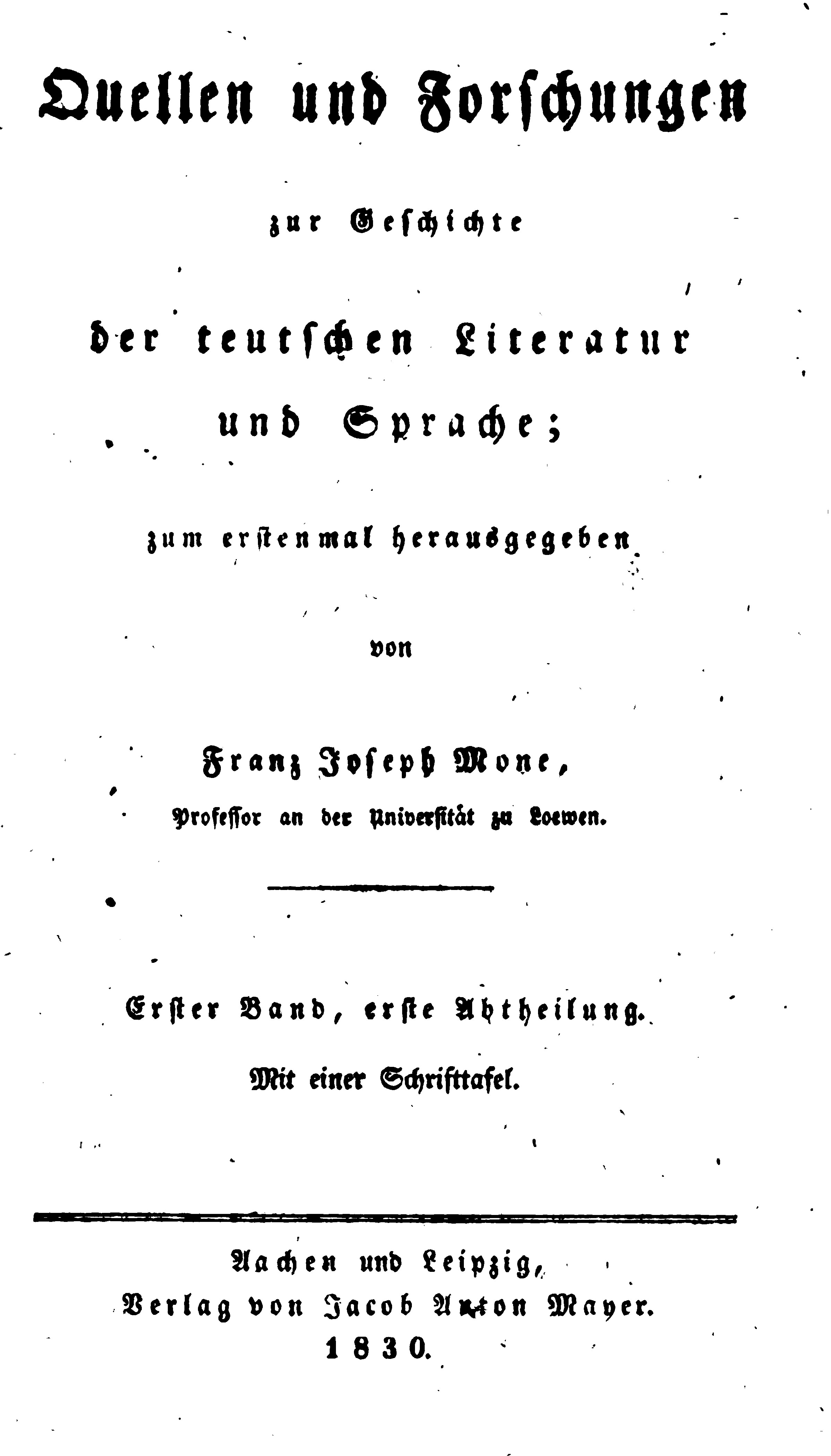 Mones umfangreiche Sammlung enhält hauptsächlich Textbeispiele zu verschiedenen mittelhochdeutschen Werken und – für unseren Kontext wichtiger – ein Kapitel ‚Proben unbekannter Mundarten‘ (S. 459ff.), das Beispiele der ‚Moselmundarten‘ und ‚Mundarten der Niedermaas‘ enthält. Für die Moselmundarten konnte der Herausgeber Franz Joseph Mone (bis 1830 Professor für Statistik und Politik an der Universität Löwen) auf Mitarbeit von luxemburgischen Kollegen zurückgreifen. Namentlich genannt werden ein ‚Hr. Pergameni‘, ‚H. Gloden aus Eich in Luxemburg‘, der 1845 einen grammatischen Anhang zu Antoine Meyers ‚Luxemburgische Gedichte und Fabeln‘ beitragen wird, ‚H. Frommes‘ aus Bettendorf und ‚H. Lorenz‘, der für die ‚Mundart des Moseltals‘ zuständig zeichnet. Nach einer kurzen Einleitung, in der die graphematischen Konventionen zur Verschriftung der jeweiligen Dialekte vorgestellt werden, folgen Sprachenproben für den jeweils gleichen Text, i.e. das Gleichnis vom verlorenen Sohn.