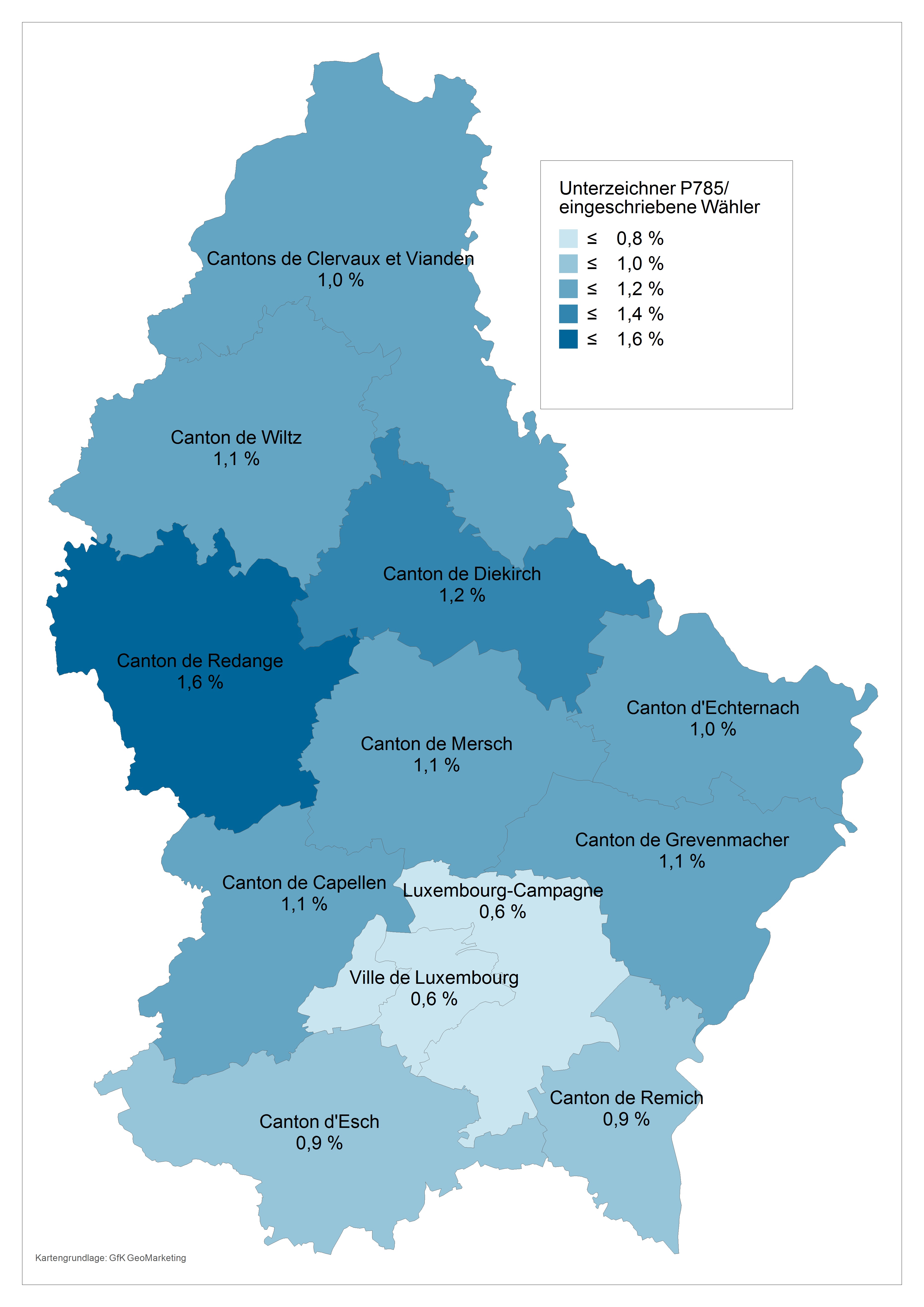 Fir déi zwou Petitiounen 698 an 725 hate mer eng regional Auswäertung vun den Ënnerschrëfte gemaach, déi mer fir déi nei Petitioun mat der selwechter Methodologie widderholl hunn. Wéi d’Kaart et weist, war hire Succès besonnesch kleng an der Haaptstad an am Rescht vum Kanton Lëtzebuerg; an deenen zwee südleche Kantonen Esch a Réimech hunn och manner Leit ënnerschriwwen, wéi méi nërdlech. Besonnesch vill Ënnerschrëften huet Petitioun am Kanton Réiden kritt.