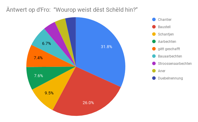 - Insgesamt hu mir net manner wéi 1185 Opnamen ausgewäert; dobäi kënnt “Chantier” op knapp 32%, “Baustell” op 26% an “Schantjen” op 9,5%.