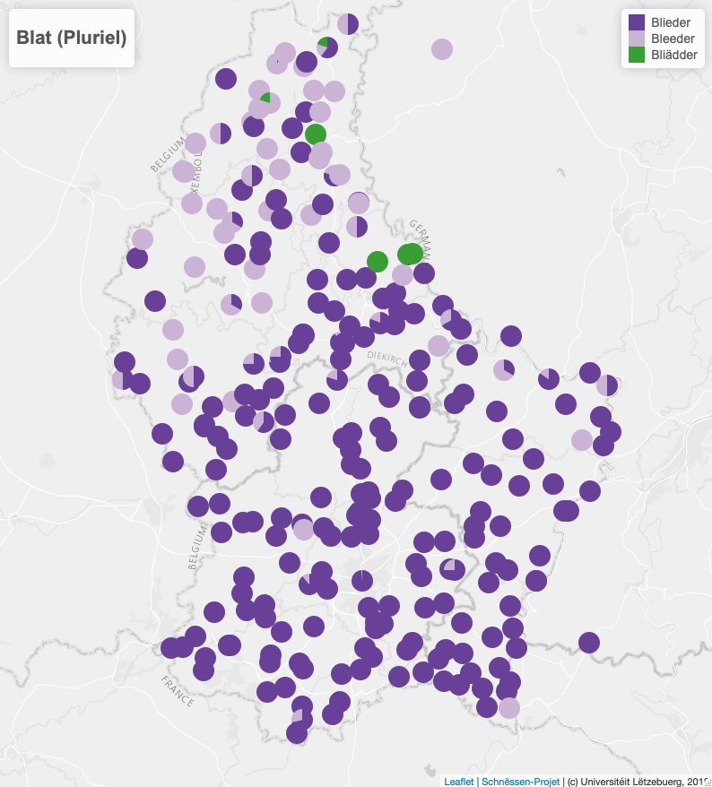 An der 1. Ronn vun der Schnëssen-App hunn d’Participanten dräi verschidde Variante fir de Pluriel vu Blieder benotzt. Dobäi handelt et sech, wéi beim Bam, ëm eng Variatioun, déi sech op d’Aussprooch vun engem Wuert bezitt. D’Variante si Blieder, Bleeder a Bliädder.