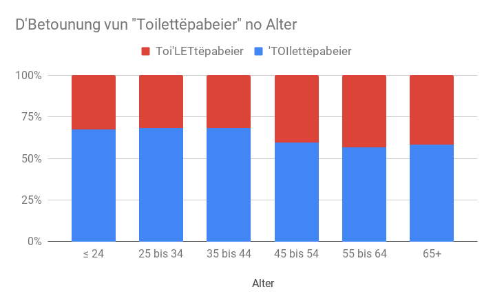 Zum Schluss elo awer nach kuerz bei d’Betounung vum Wuert Toilettëpabeier. Hei kann een nämlech entweeder déi éischt Silb (TOIlettëpabeier) oder déi zweet Silb (ToiLETtepabeier) betounen. Wärend d’Betounung TOIlettëpabeier mat 65,1 % (753 Opnamen) méi dacks virkënnt an och esou am LOD festgehalen ass, kënnt d’Betounung ToiLETtëpabeier ëmmerhin och op 34,9 % (403 Opnamen). Obwuel den Alter vun de Spriecher*innen beim Choix vun der Betounung keng primär Roll spillt, geet aus dem Diagramm ervir, dass d’Betounung op der zweeter Silb bei deenen dräi eelsten Altersgruppen e bësse méi dacks virkënnt (ëm 42 %) wéi an deenen dräi jéngsten (ëm 32 %).