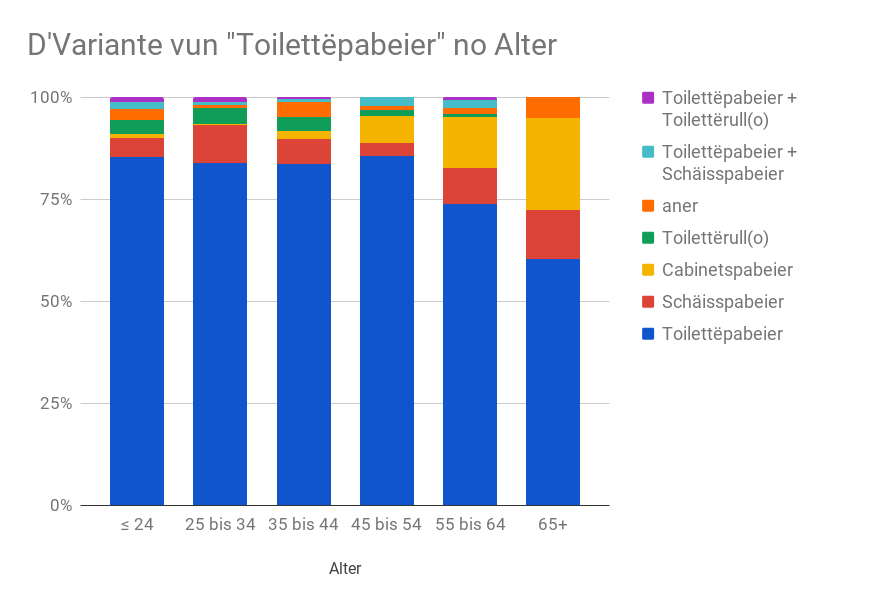 Kuckt een sech d’Verdeelung vun de verschiddene Varianten no Alter un, gesäit een, dass den Toilettëpabeier an allen Altersgruppe staark dominéiert. Eppes fält awer op: E bësse manner staark ass déi Dominanz nach an den zwou eeleren Altersgruppen, well hei de Cabinetspabeier nach méi dacks genannt gouf. Vun de Spriecher*innen ënner 45 Joer gouf dës Variant allerdéngs kaum nach genannt.