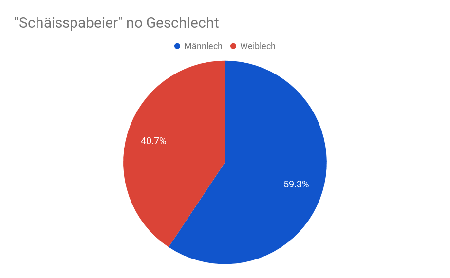 Bei enger vun de Varianten hu mir dann och nach eng Opfällegkeet bei eiser Analys fonnt: Bei der Variant Schäisspabeier, déi ëmmerhin 92 Mol genannt gouf an domat am zweetheefegsten an eisen Date virkënnt, weist sech, dass Männer (59,3 %) dës Variant e gutt Stéck méi dacks benotzt hu wéi Fraen (40,7 %).