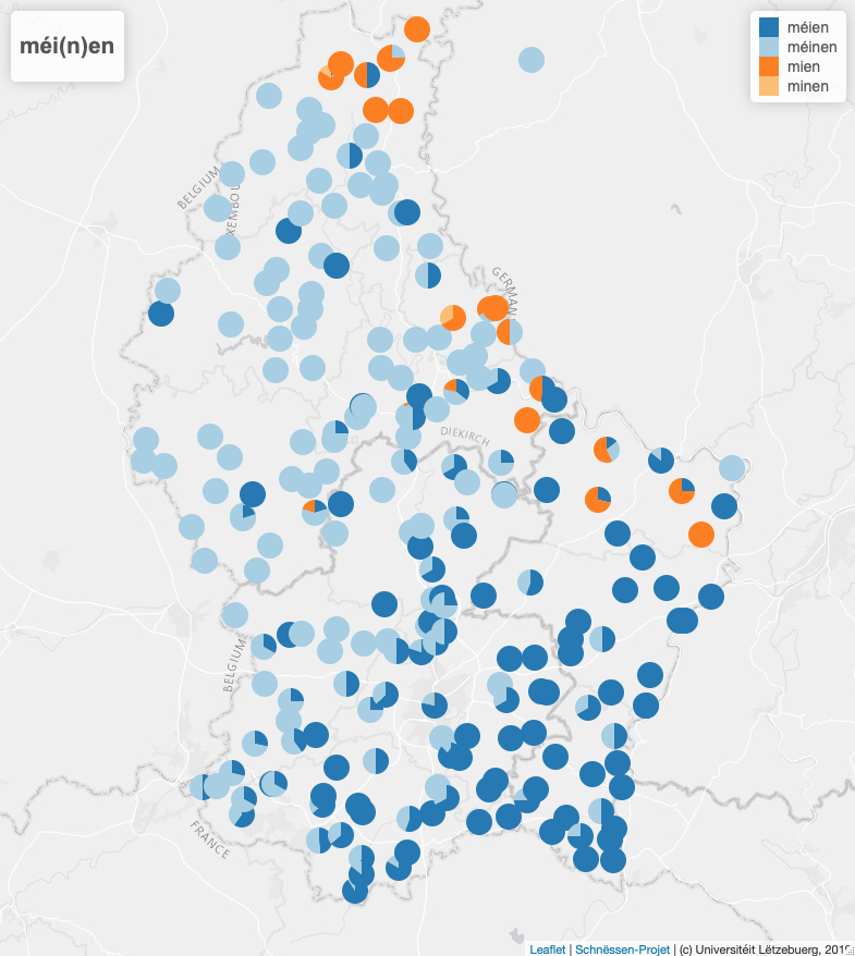 Richteg interessant gëtt et dann awer, wann een sech d’Verdeelung vun de Varianten op enger Lëtzebuerg-Kaart ukuckt – an där hu mer der an dësem Fall direkt zwou. Fir d’Verb méi(n)en gëtt et nämlech schonn am Luxemburger Sprachatlas (LSA, 1963) eng Kaart, déi op Date vu virum Zweete Weltkrich baséiert. Ze gesinn ass dorop fir d’éischt emol eng (graff) Ost-West-Zweedeelung mat der Variant mat n am Westen an där ouni n am Oste vu Lëtzebuerg, woubäi do an zwee Gebidder och mien ze fannen ass. Vergläicht een dës Verdeelung elo mat där op eiser neier Schnëssen-Kaart, dann erkennt ee relativ grouss Gemeinsamkeeten: Virun allem si beispillsweis nach déi zwee mien-Gebidder op der Kaart ze fannen, eent ganz am Norde vum Land an dat anert am Osten, dat sech vun der Veianer Ëmgéigend erof bis op Uesweller a Mompech zitt. Et fält awer och op, dass sech an dësem Gebitt och méien- a méinen-Nennungen ënnermëschen. Weiderhi stellt een dann och fest, dass d’Haaptverdeelung vu méinen nach ëmmer am Westen ass (vum Nordwesten iwwert den Zentrum bis erof an de Südwesten) a méien méi am Oste vum Land (respektiv am (Süd-)Osten, am Zentrum an am méi ëstlechen Deel vum Minett ) verbreet ass. Allgemeng bleift zum Schluss awer festzehalen, dass et op der Schnëssen-Kaart keng sou kloer méinen- a méien-Gebidder ginn wéi et op der LSA-Kaart de Fall ass, mee et éischter och vill Géigende gëtt, an deenen dës zwou Variante virkommen.