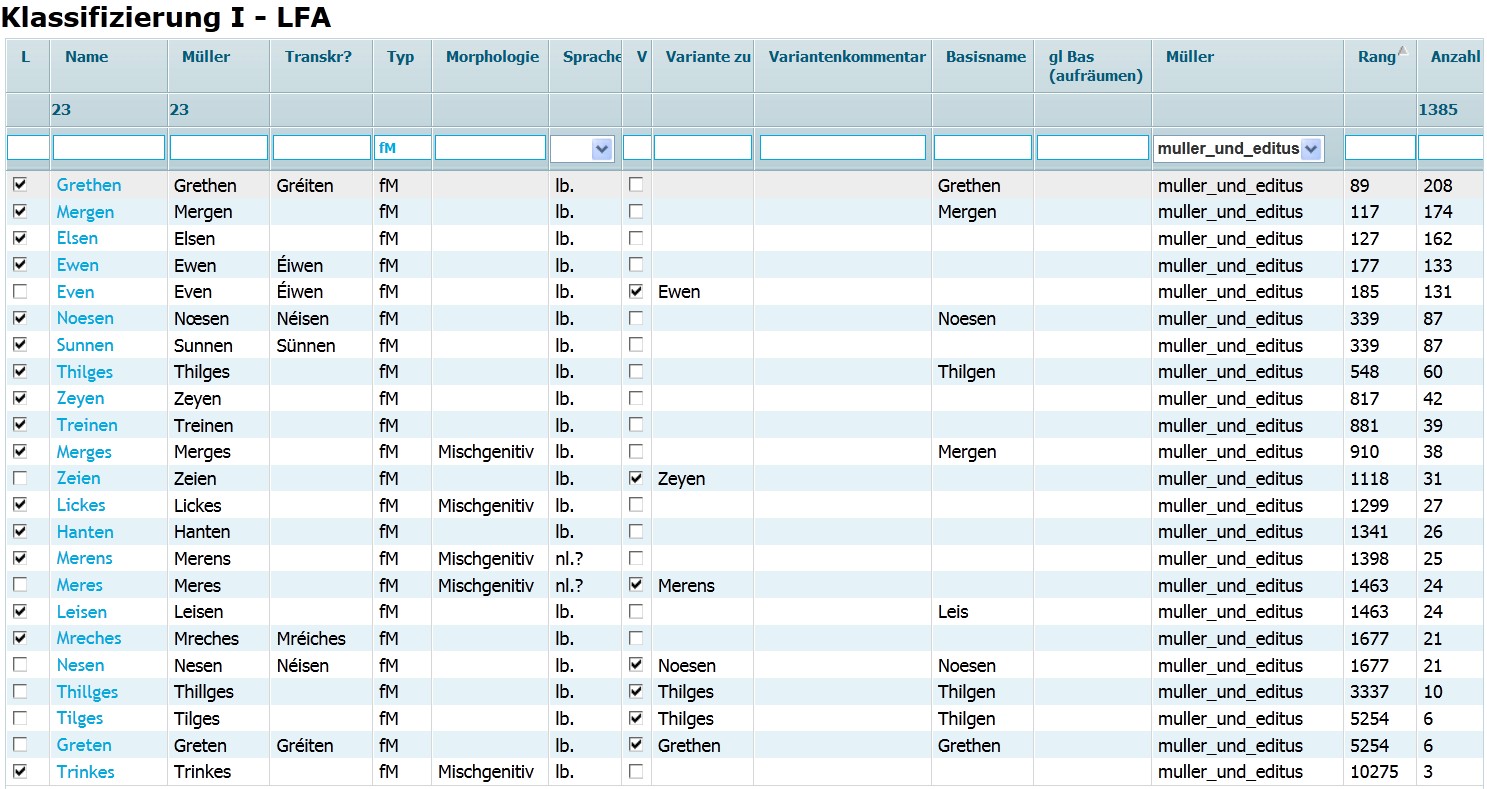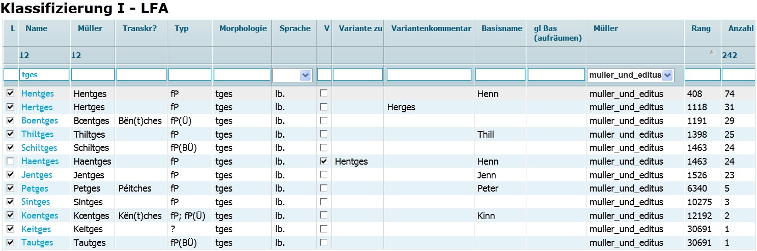 Das Projekt verfolgt u.a. das Ziel, die Informationen und Untersuchungen zu den einzelnen Familiennamen in einer Datenbank zu vereinen und zu archivieren. Zur Entwicklung des Datenbankfrontend wurde die Javascript-Umgebung DHTMLXgrid verwendet, die eine flexible Gestaltung von datenbankgenerierten Tabellen auf XML-Basis bereitstellt. Die einzelnen Spalten der Datenbank sind durchsuchbar und beliebig sortierbar. Damit können z.B. alle Namen auf -tges angezeigt werden. Bei diesen handelt es sich meist um genitivische Bildungen zu Namen auf -tgen und sie sind daher flektierte Patronyme (zum Namen des Vaters) und in selteneren Fällen flektierte Metronyme (zum Namen der Mutter):