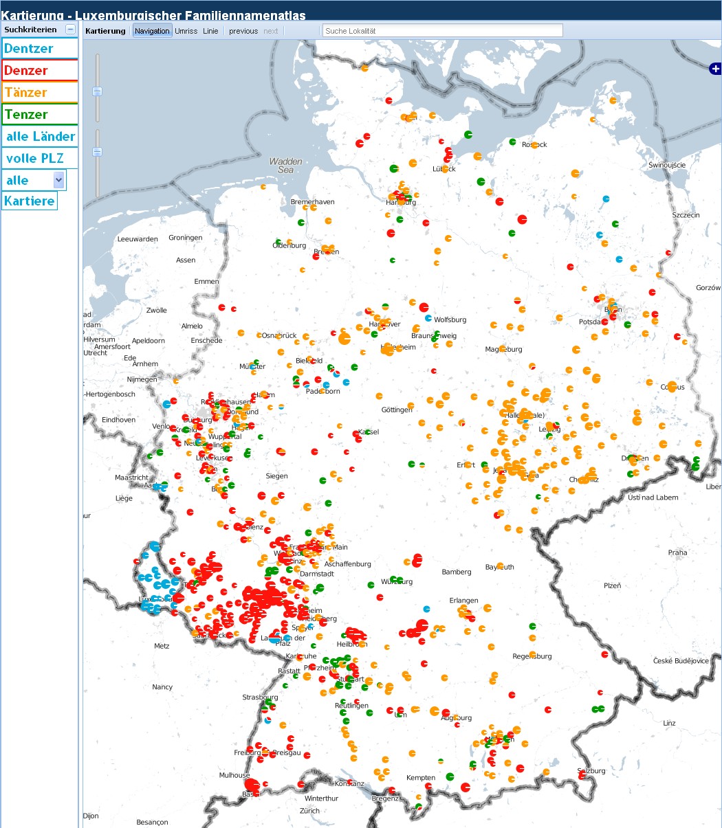 Die Verteilung der Familiennamen wird auf einer Karte dynamisch dargestellt. Dadurch werden verschiedene Verbreitungsmuster ersichtlich, die auf sprachwissenschaftliche Phänomene schließen lassen. Die Verteilung Schmit vs. Schmitz zeigt zum Beispiel die Kontinuität der Isoglosse auch in unseren Sprachraum hinein.