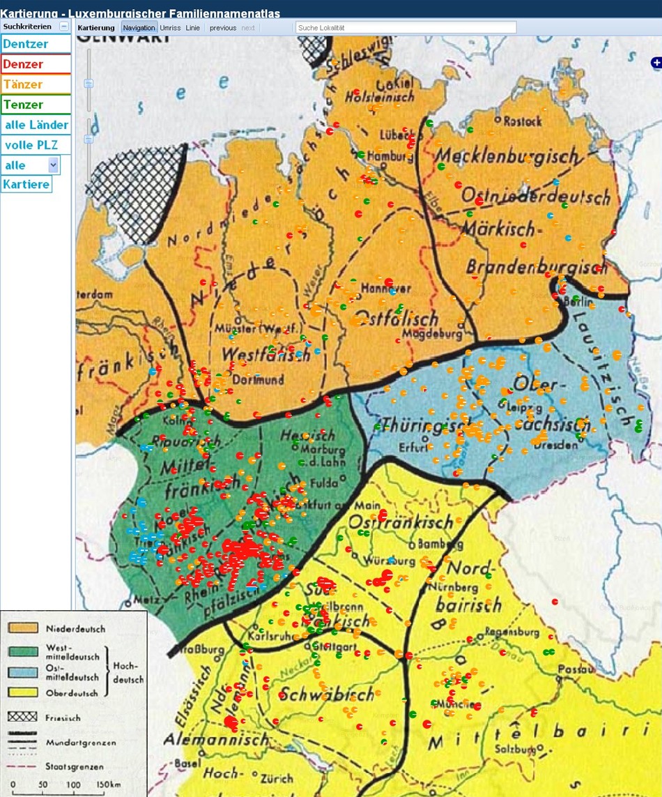 Im folgenden Beispiel ist die Verteilung der Familiennamen aus der Bezeichnung für den Tänzer auf eine Einteilung der deutschen Dialekte projiziert.