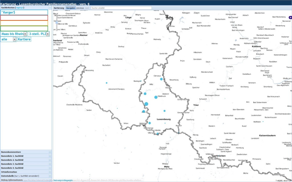 Die folgende Abbildung zeigt die Suchmaske (links) und die Kartierung (rechts). Es ist möglich, bis zu vier Namen gleichzeitig zu kartieren. Die zugehörigen Häufigkeitsangaben werden pro Ortspunkt in der Datenbank abgefragt und in ihre relativen Häufigkeiten (in Promille) umgerechnet, um Vergleichsmöglichkeiten zwischen Ortspunkten zu gewährleisten. Die relative Häufigkeit wird auf der Karte durch unterschiedlich große Kreissymbole angezeigt. Wenn mehr als ein Name kartiert wird, verwandeln sich die Kreissymbole in proportional aufgeteilte Kuchendiagramme, sodass der Anteil des jeweiligen Namens pro Ortspunkt abgelesen werden kann; diese Technik basiert auf einer Javascript-Lösung, die von Thematic Mapping entwickelt wurde. Im Beispiel sind vier Varianten des Namens Mathieu für die Maas-Rhein-Region kartiert. Die Symbolfarbe korreliert mit dem in den Suchfeldern links eingetragenen Namen. Beliebiges Vergrößern oder Verkleinern des Kartenausschnittes ist möglich, dabei werden die Kuchendiagramme mitskaliert.