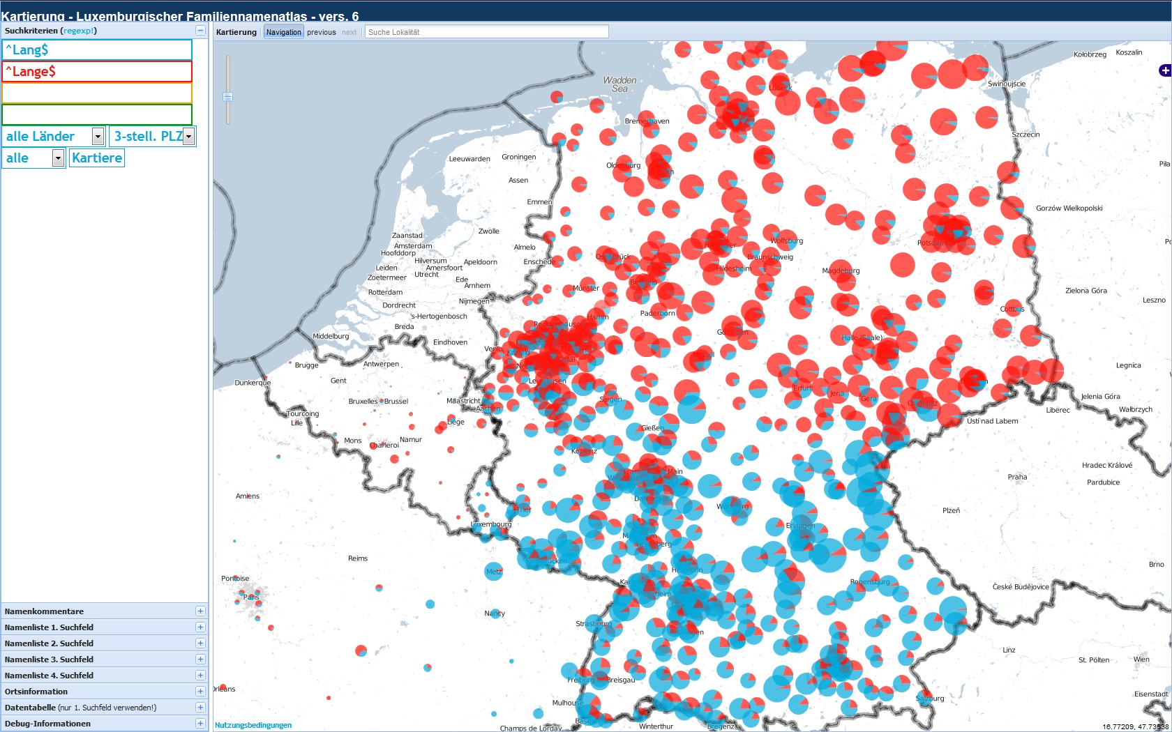 Die Datenbank enthält die Namendaten der Länder Luxemburg, Frankreich, Belgien und Deutschland. Diese große Datenbasis erlaubt es auch, komplexe Karten zu erstellen, wie z.B. die folgende Karte zur Verteilung von Lang und Lange in Deutschland, Belgien und Luxemburg. Einerseits wird so die Grenze der Apokope sichtbar, andererseits ist auch die Variation der geografischen Namenverteilung, besonders im Süden, erkennbar.