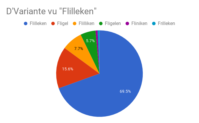 Kucke mer eis fir d‘éischt déi allgemeng Verdeelung vun de Varianten un. Op dem Kéis erkennt een, datt mer et am ganze mat 6 ënnerschiddleche Varianten ze dinn hunn: Flilleken (69,5%), Fligel (15,6%), Flilliken (7,7%), Fligelen (5,7%), Fliniken (0,8%) a Frilleken (0,7%).