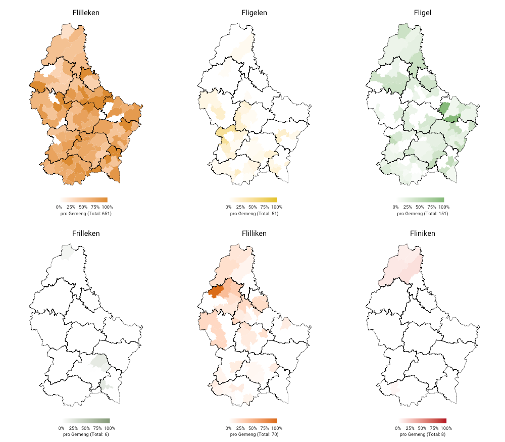 Wéi d‘Verdeelung duerchschénge léisst, hu mer e ganz klore Gewënner ënnert de Varianten: Flilleken. Aus dësem Grond ass et och net weider verwonnerlech, datt e Bléck op d‘Kaart eis verdäitlecht, datt dës Variant am ganze Land virkënnt. Wat d‘Kaart ausserdeem weist: Bei de Variante Flilliken, Fliniken a Frilleken handelt et sech ëm regional Varianten. D‘Flillike sinn zwar vereenzelt och an der ënneschter Hallschent vu Lëtzebuerg ze fannen, kommen awer méi konzentréiert am Norde vum Land vir. Och bei de Fliniken handelt et sech ëm eng nërdlech Variant. Si kënnt allerdéngs effektiv nëmme ganz uewen am Kanton Klierf vir. Schliisslech deit sech bei de Frilleken un, datt dës Variant éischter am Oste vum Land vertrueden ass.