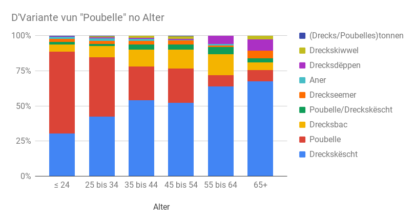 D’Staffelung nom Alter seet bei dësem Beispill vill aus. Engersäits kann een erkennen, datt am Verlaf vu jonk bis al konstant de Gebrauch vun aneren Alternativen niewent Poubelle an Dreckskëscht zouhëlt. Anerersäits ass et an den Zilgrupp bis 34 Joer d’Poubelle, déi ufänkt, méi a méi an den alldeegleche Gebrauch ze kommen an domat aner Varianten, a virun allem d’Dreckskëscht ze verdrängen. D’Betounung vu Poubelle op där éischter Silb weist allerdéngs och, datt de Begrëff scho staark naturaliséiert ass an déi franséisch Aussprooch verluer huet.