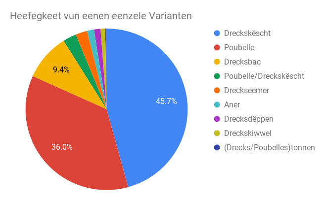 Dreckskëscht, 45,7%, a Poubelle, 36,0%, sinn déi heefegst Varianten, allerdéngs bitt et sech un, all Forme mat Dreck– zesummen ze leeën, woumat dës da vill méi däitlech an der Frequenz virleien (59,8%). An deem Fall gëtt et quasi eng Heefegkeet vun zwee Drëttel géigeniwwer engem Drëttel. An enger weiderer Analys wär et sécherlech interessant ze kucken, ob d’Gréisst vun der Këscht oder dem Dëppen eng Roll op d’Bezeechnung huet, déi d’Leit benotzen.