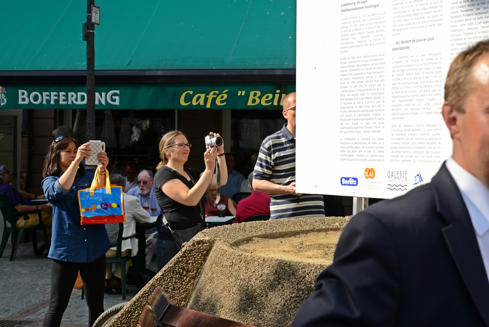 Fir den Auteur ass et lëschteg, d’Touristen an déi aner Leit ze beobachten, wéi se den Text liesen, wat fir eng vun deene véier Sproochen se preferéieren a wéi se d’Informatioun op hirem Smartphone mathuelen.