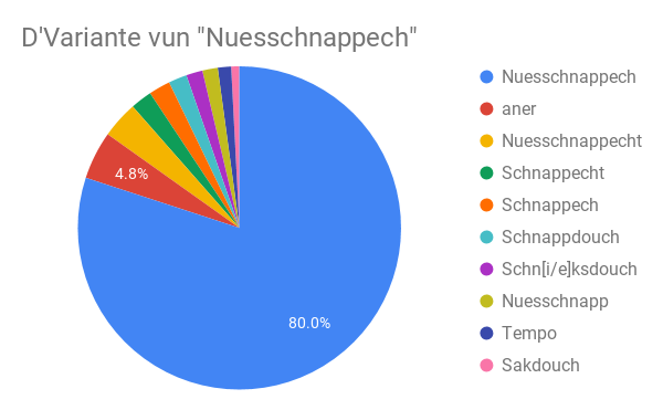 Änlech wéi bei Seechomes, Paiperlek oder Aperhoer gëtt dëse wichtegen Alldagsgéigestand mat enger Hellewull vu Variante benannt. An der Schnëssen-App hu mer also Nuesschnappech mat engem Bild ofgefrot a kruten 976 Äntwerten. An der globaler Verdeelung am Kéisdiagramm gesäit een, dass Nuesschnappech mat 80 % (781) d’Haaptvariant fir déi meescht Leit ass, deelweis och erweidert op Pabeiersnuesschnappech, woumat gläichzäiteg och eent vun de längste lëtzebuergesche Wierder virläit. Op déi reschtlech 20 % (195) verdeele sech eng ganz Rei vu Variante wéi Schnappdouch, Schniksdouch (am Norden), Nuesschnapp, Sakdouch oder och Tempo, dat wéi Bic oder Scotch vun engem Markennumm ofgeleet ass. An der Kategorie ‘aner’ fanne sech apaart Variante wéi Lingette, Nasdouch, Schnapsdech, Täschepabeier oder Kozendouch.