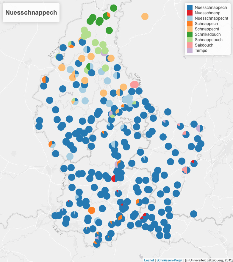 gesäit, dass d’Guttland relativ eenheetlech op Nuesschnappech agestallt ass. Nërdlech vun Dikrech fänkt eng schéi gestaffelt regional Verdeelung un, wa sech Schnappecht, Schnappdouch a schliisslech Schniksdouch ofwiesselen. Domat fanne mer an dësem nërdlechen Dialekt och déi eelst Virstufe vum haut preferéierten Nuesschnappech.