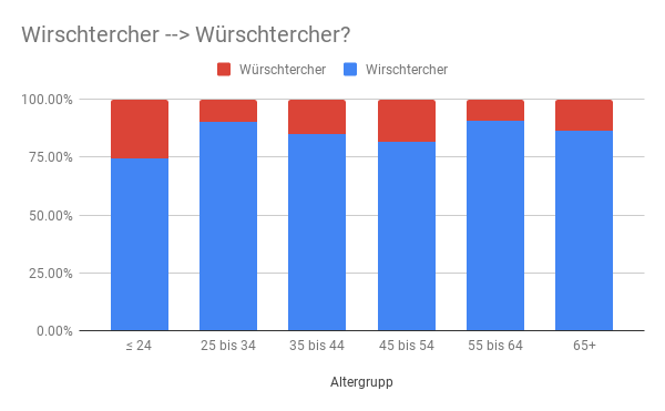 D’Verdeelung no Alter weist, datt d’Wirschtercher an all Grupp (mat groussen Ofstand) déi meeschtgenannte Variant sinn. Gläichzäiteg ass awer ze erkennen, datt de Gebrauch vun Wirschtercher an eisen Opnamen bei deene Jonken no an no ofhëlt, soudass se an der Altersgrupp ≤24 nëmmen nach 46,4% ausmaachen.