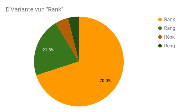 Am Kader vun der Datenerhiewung mat der Schnëssen-App wollte mir vun de Participante*ë wëssen, wéi si dat klengt, meeschtens ronn a gëllen, Schmockstéck nennen, dat een an der Regel um Fanger dréit an domat seng Zougehéieregkeet zu engem anere Mënsch weise kann. Dowéinst hate mir e Bild presentéiert a mir wollten de Singulier an de Pluriel héieren, fir doraus verschidde Schlëss zéien ze kënnen. Hei konnte mir an enger éischter Phas vun eiser Auswäertung bei 384 Opname virun allem zwou Saache beim Singulier feststellen: Éischtens sinn d’Variante mam a als Vokal (Rank resp. Rang) mat 70% (250 Opnamen) resp. 21% (76) wäitaus méi verbreet wéi déi mat engem e (Rénk resp. Réng) mat 4,8% (17) resp. 3,9% (14). Zweetens kënnt d’Variant mat der Endung op -g (Rang, Réng) op ganzer 26%. Dat ass virun allem dowéinst interessant, well keng vun dëse g-Varianten am aktuellen LOD oder deenen eeleren Dictionnairë wéi dem Luxemburger Wörterbuch (1950) festgehale sinn.