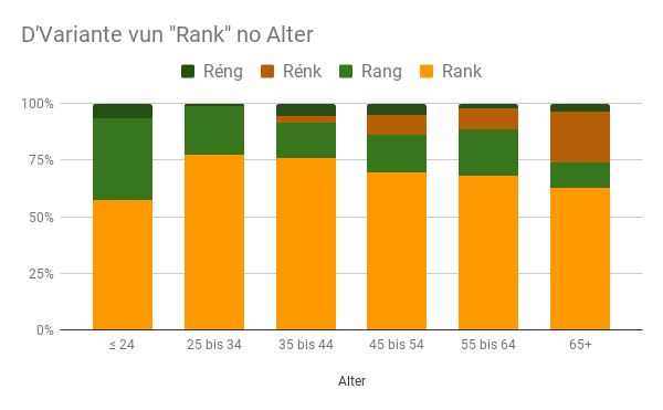 Kuckt ee sech d’Verdeelung nom Alter un, fält op, datt et virun allem déi jéngst Participante*ë sinn, déi dës Formen (mat g-Endung) méi dacks gebrauchen. D’Undeeler vun dëse Varianten (Rang/Réng) sinn deemno an deenen aneren Altersgruppe méi niddereg, wéi de folgenden Diagramm weist. Geheit een e Bléck op d’Rank- an d’Rénk-Varianten, stellt ee fest, datt de Rank mat Ausnam vun deene Jéngsten iwwert d’Altergruppen ewech zimlech stabil bleift, de Rénk dogéint awer just an den Altersgruppen iwwer 35 Joer virkënnt.