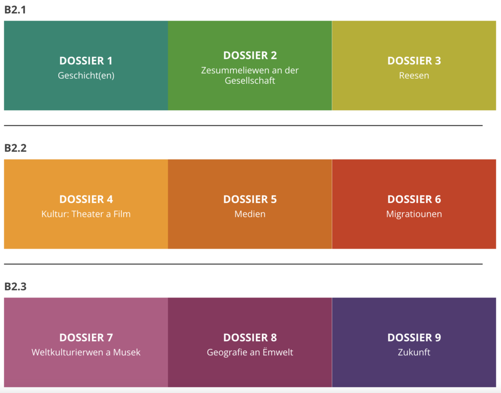 Huelt Iech e bëssen Zäit – och als Mammesproochler – a klickt Iech duerch déi verschidde Léiereenheeten: An 9 Dossiere fannt Der eng Rei Informatiounen iwwer d’Kultur- an d’Literaturzeen zu Lëtzebuerg mat passende Schreif- a Schwätzübungen an aneren Exercicer, fir Lies- an Héierverstoen ze üben. Et geet awer och ëm einfach Alldagstheeme wéi Noperschaft oder Reesen – alles, fir d’Leit aus verschiddene Kulturkreesser an Altersklassen ze motivéieren, sech op Lëtzebuergesch auszedrécken.