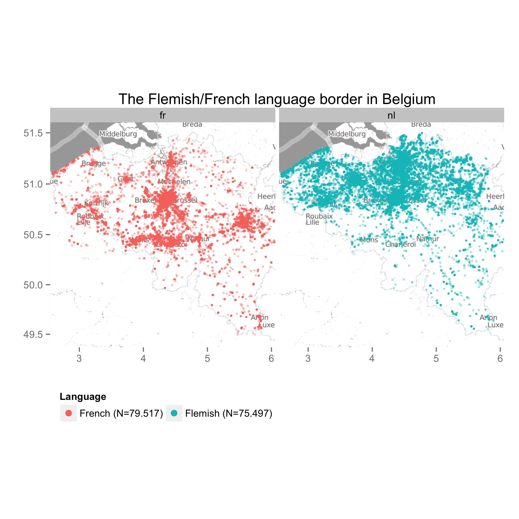 The most pertinent question for Belgium concerns of course the language border. The next map contains only data from French and Flemish, and the territorial division between Flanders and Wallonia is clearly discernible.