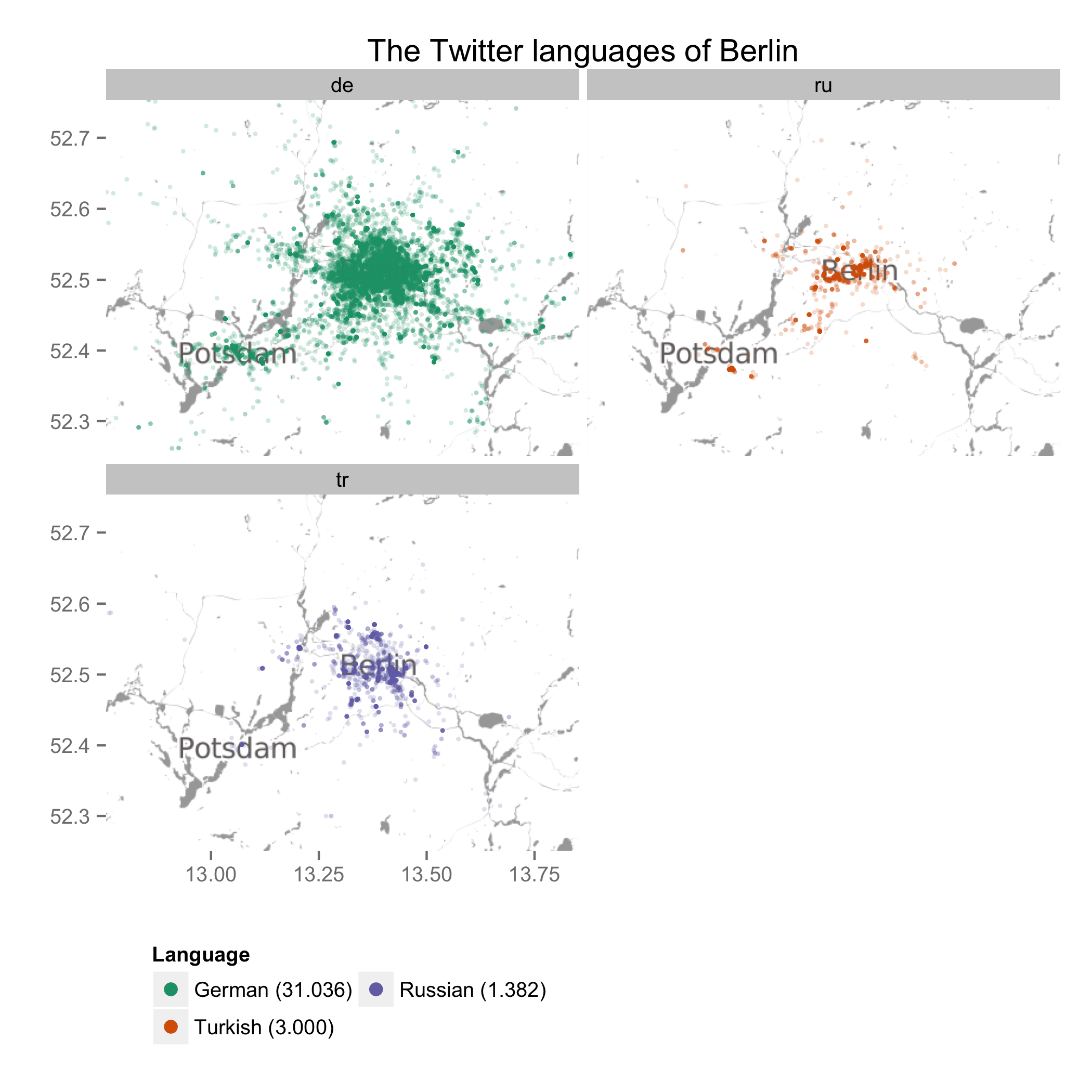 Recall: Twitter is used by a certain segment of society, often with a technophile background. Only a fraction of the sent tweets is geocoded, i.e. the user sharing her/his location. Depending on country, only 1 to 3 % of all tweets have geocodes. One tiny dot on the map represents a geocoded tweet colored according to language. The detection of the language is done automatically (either on Twitter’s server or using the python package ‚Chromium compact language detection‚). These methods are not error-free, but there is no other way to get a grip on this big data.