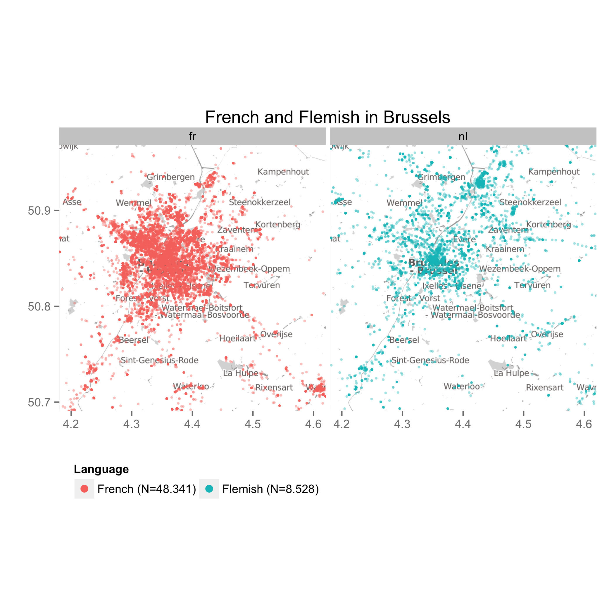 This brings me finally to the officially bilingual city of Brussels. The twitter data here shows a rather clear picture: French is by far the most used language and Flemish is only used in approximately a sixth of the messages.