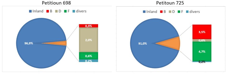 D’Grafik 2 weist, aus wéi enge Länner d’Ënnerschrëfte kommen. D’Petitioun fir de Status Quo kritt méi Ënnerschrëften aus dem Ausland an dës kommen éischter aus Frankräich an der Belsch. Dogéint kritt d’Petitioun 698 méi Stëmmen aus Däitschland.