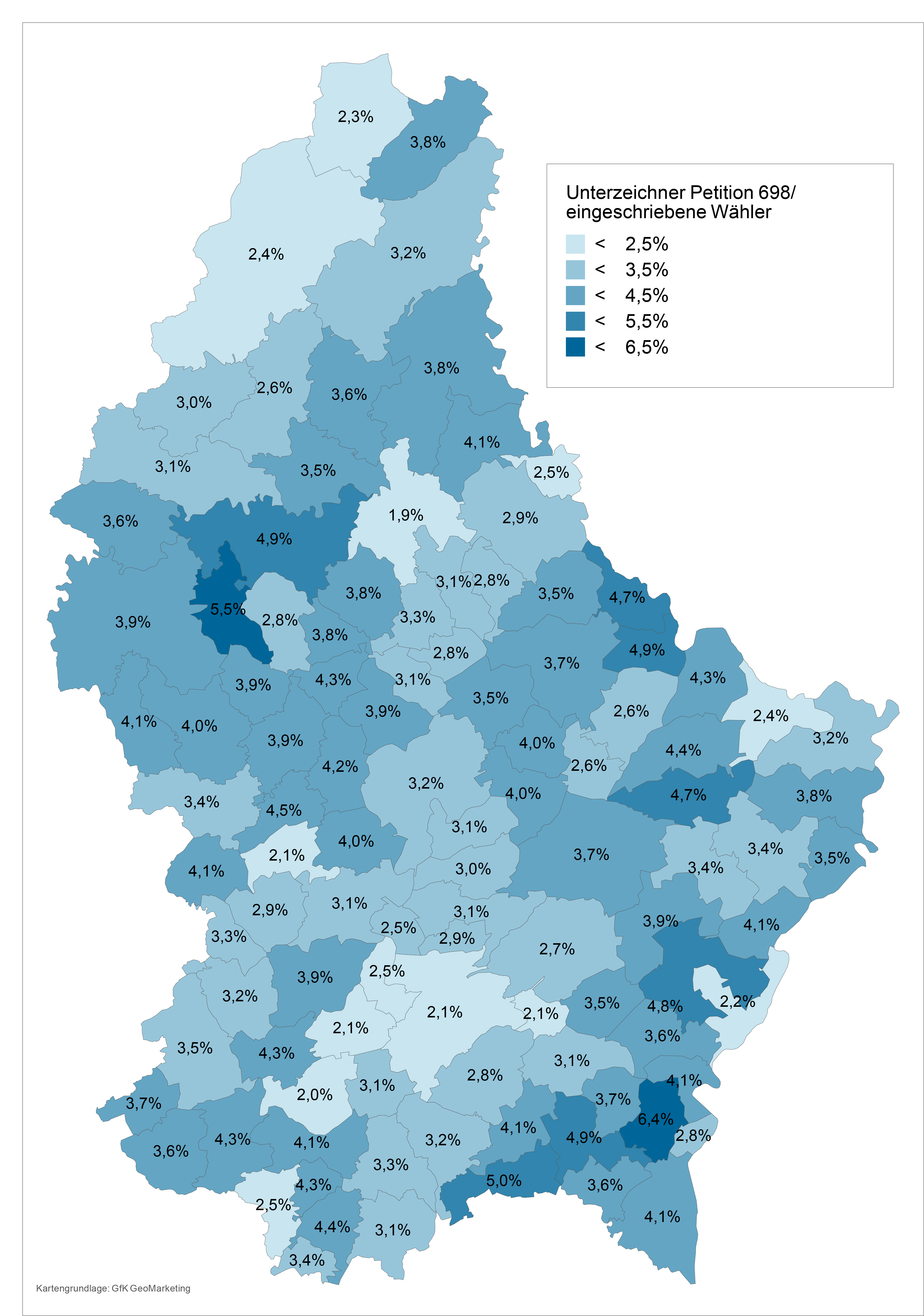 Dës lescht Interpretatioun gëtt duerch d’Kaart 3 ënnerstëtzt. Si weist d’Zuel vun de publizéierten Ënnerschrëfte vun der Petitioun 698 an enger Gemeng gedeelt duerch d’Zuel vun den ageschriwwene Wieler. Wann ee kleng Gemengen ewechléisst, da kritt se prozentual am mannsten Ënnerschrëften an der Haaptstad, zu Bartreng a Sandweiler (2,1%), iewel och zu Iechternach (2,4%). Et huet een d’Impressioun, datt se an de Gemenge laanscht déi grouss Kommunikatiounsachsen (z.B. den Uelzechtdall erop a weider duerch d’Nordstad) am mannsten Zousproch kritt.