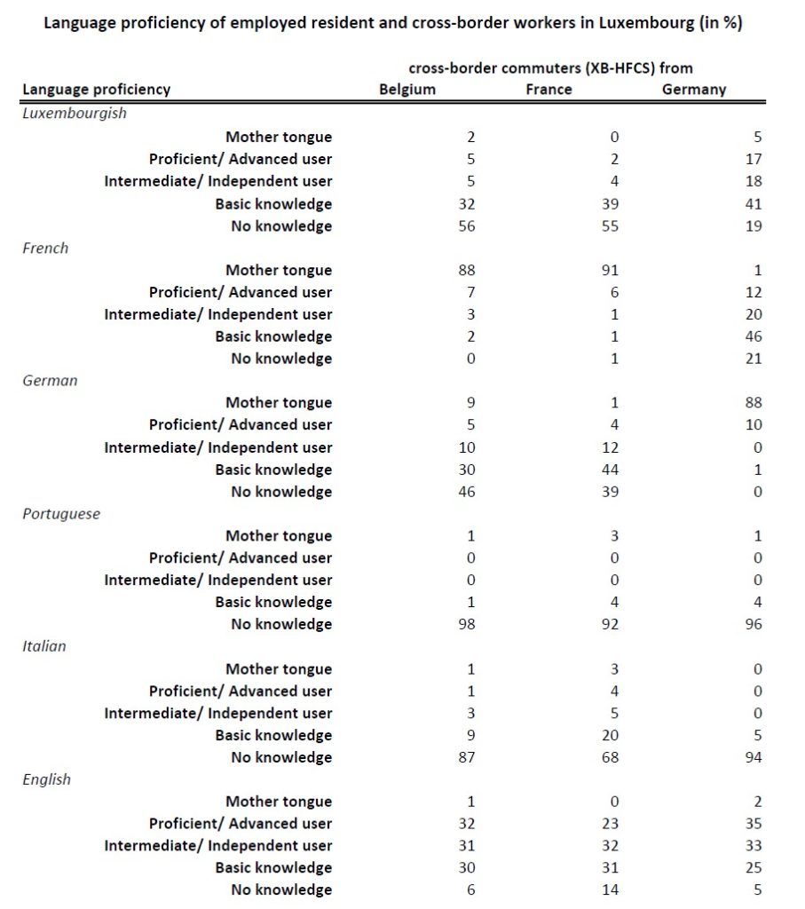 Le tableau montre la compétence linguistiques des frontaliers selon le pays de résidence. Celle-ci est mesurée sur une échelle à cinq niveaux (langue maternelle, niveau avancé, niveau intermédiaire, connaissances de base, aucune connaissance). On remarquera d’abord que les habitants n’ont pas nécessairement comme langue maternelle la langue associée à leur pays de résidence. En Belgique et en Allemagne 88% indiquent respectivement le français et l’allemand comme langue maternelle ; en France ce sont 91%. Les personnes indiquant le luxembourgeois comme langue maternelle sont probablement des Luxembourgeois ayant émigré récemment, la plupart du temps, à cause de la pression sur le marché immobilier.
