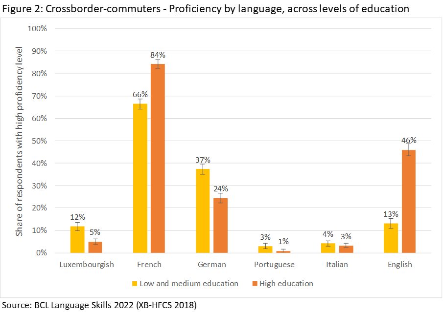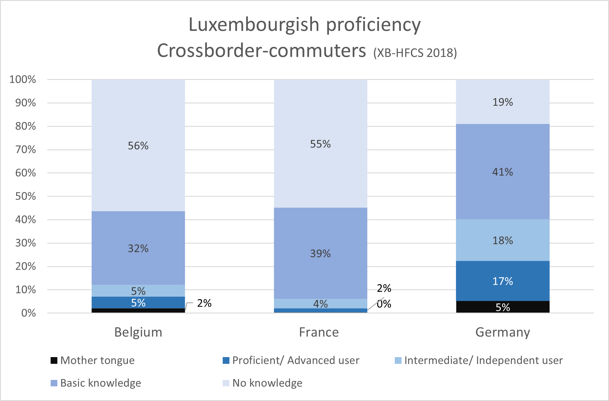 L’anglais est la langue la plus connue. Seulement 5% des frontaliers d’Allemagne et 6% des frontaliers de Belgique disent l’ignorer. Pour les frontaliers de France ce taux monte à 14%. La langue du voisin respectif est moins connue : 21% des frontaliers d’Allemagne disent n’avoir aucune notion de français, tandis que 46% des frontaliers de Belgique et 39% des frontaliers de France disent ignorer l’allemand.