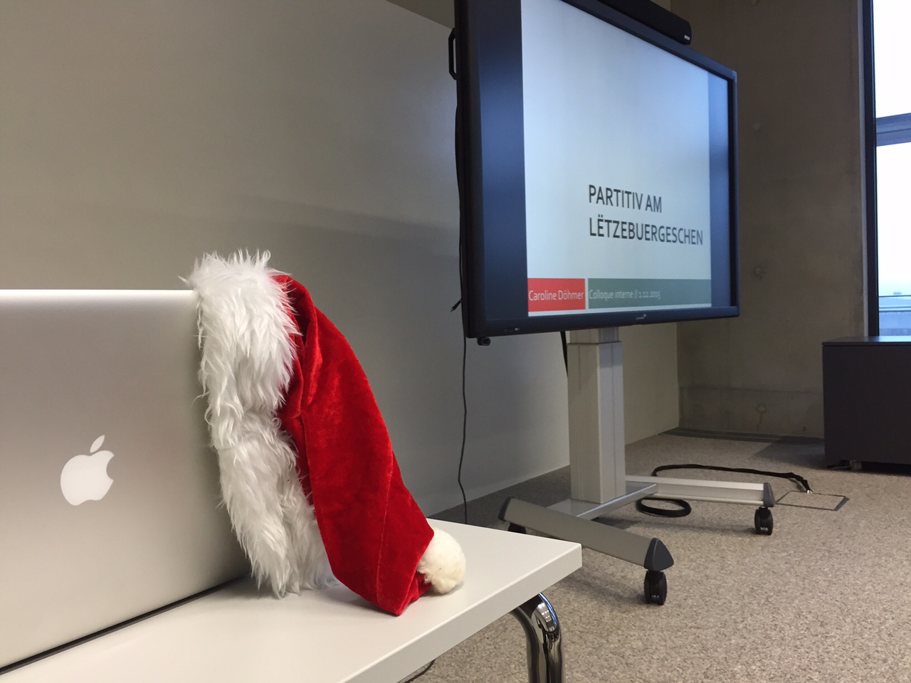 D’Caroline Döhmer huet am leschte Colloque en Deel vu senger Dokteraarbecht virgestallt, dës Kéier goung et ëm de Partitiv am Lëtzebuergeschen. Wéi den Numm et scho seet, handelt et sech dobäi ëm eng Form, déi en Deel vun engem Ganzen oder vun enger onbestëmmter Quantitéit bezeechent. Zum Beispill: ‚Ech kréien där ni genuch‘, woubäi sech den „där“ als Partitivpronom hei op eppes bezitt, wat virdru genannt ginn ass (hei waren et „Wirschtercher“). Als Partitivformen hu mer „däers/es“ an „där/der“, je nodeems, ob de Partitiv sech op en onzielbare Singulier am Masculin/Neutre bezitt (hei gëllen d’Formen „däers/es“) oder op en onzielbare Féminin resp. e Pluriel (hei fanne mer dann d’Formen „där/der“). D’Méigelechkeet, déi Partitivitéit esou auszedrécken, gëtt et am Däitschen zum Beispill net. Hei misst een auswäichen op eppes ewéi „davon“ oder „welches“ („Hu mer es nach?“ wier dann „Haben wir noch welches?“). Am Virtrag goung et gréisstendeels ëm d’Funktioun vum Partitiv, dat heescht: Wat wëll de Spriecher genee soen, wann en de Partitiv benotzt? Dacks sinn et just kleng Nuancen, déi en Ënnerscheed ausmaachen. Frot Iech emol selwer, ob et en Ënnerscheed tëschent dëse Sätz gëtt, a wa jo, wéi een: