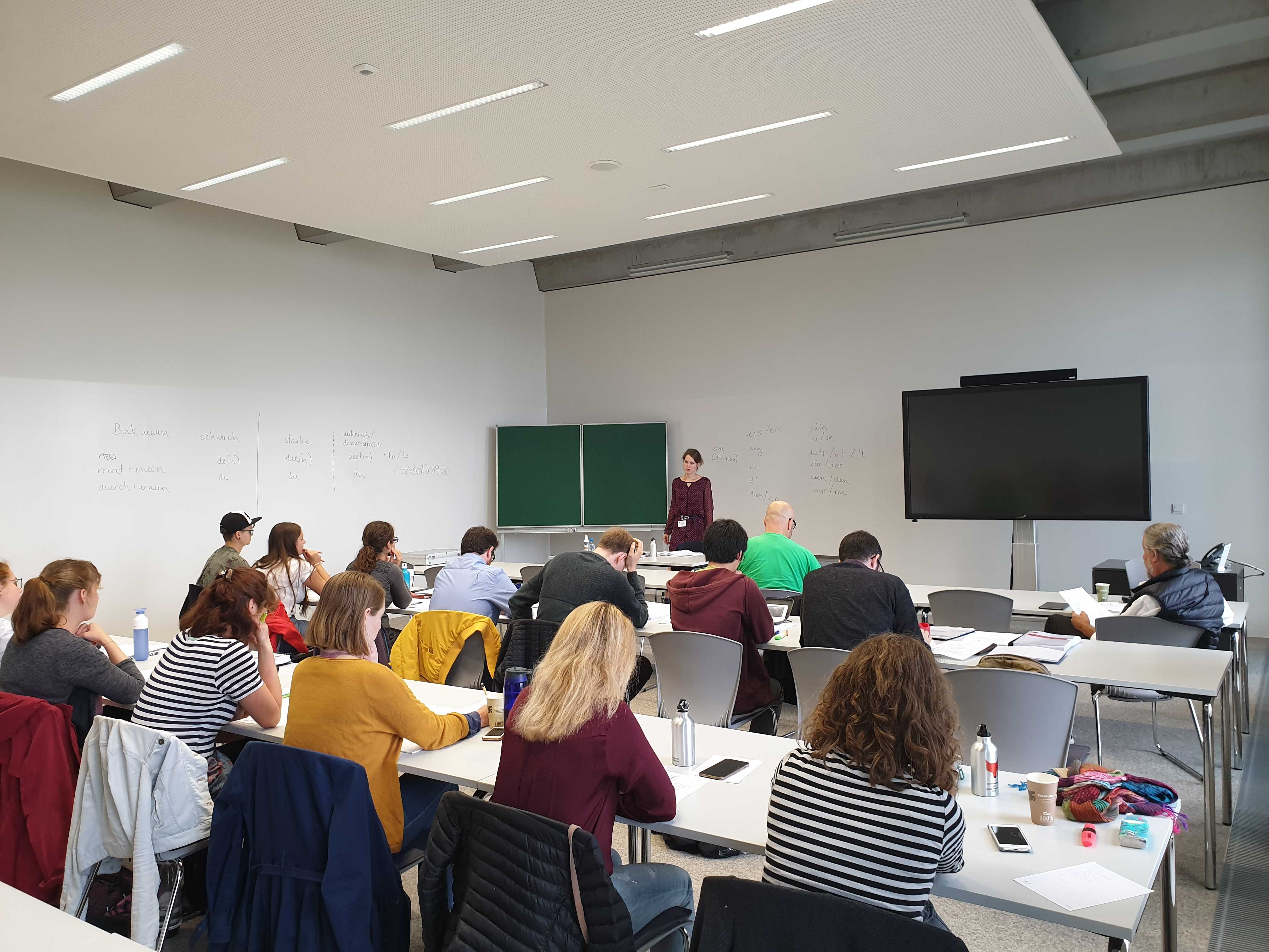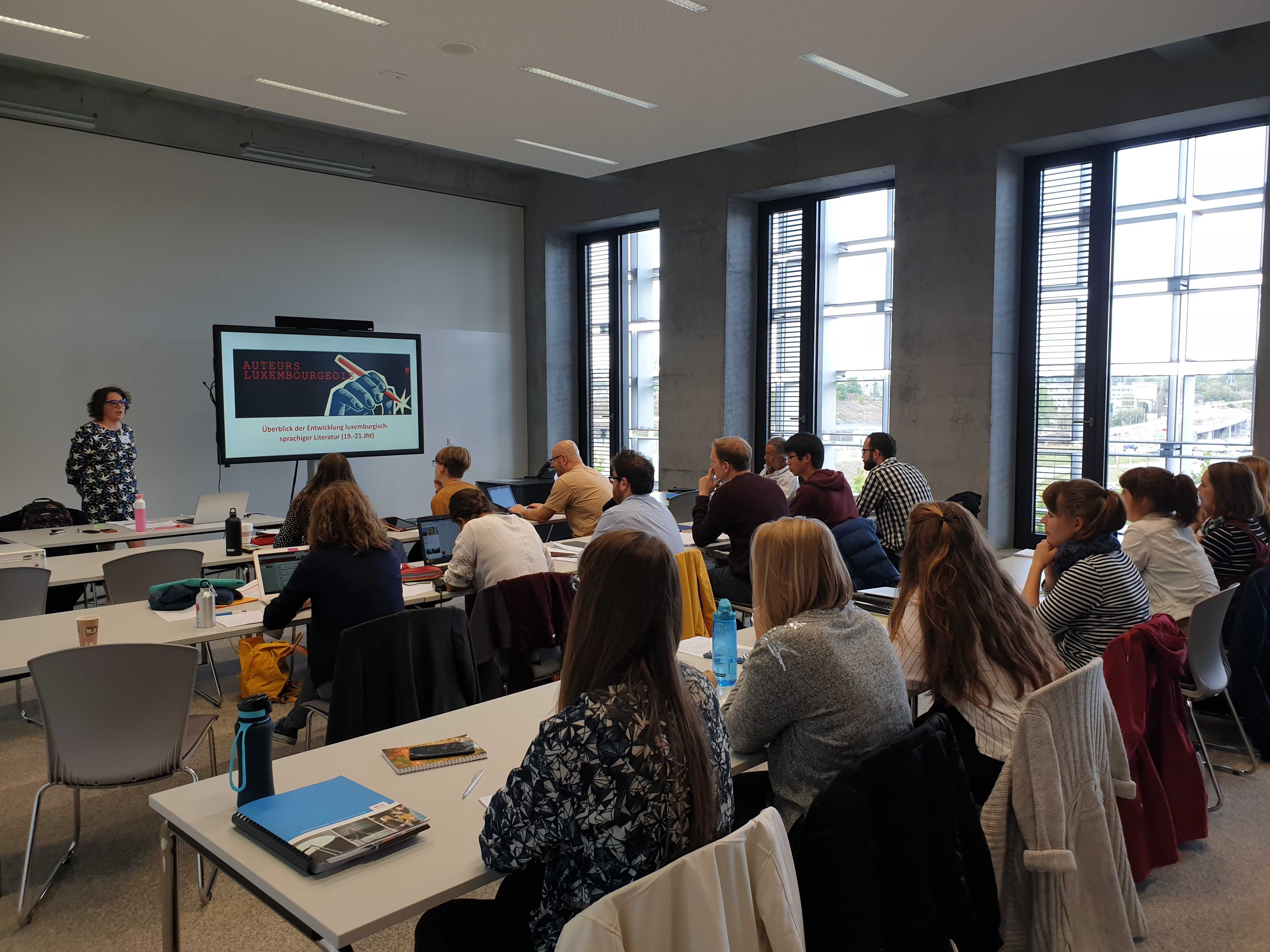 No méintelaanger Virbereedung war et vum 9. bis den 13. September endlech esou wäit. Fir eis Summer School zum Lëtzebuergeschen, déi d’Institut fir lëtzebuergesch Sprooch- a Literaturwëssenschaft dëst Joer fir d’zweet Kéier organiséiert huet, hunn 18 Participante*ën – virun allem Bachelor-, Master- a PhD-Student*innen – ë.a. aus Däitschland, der Ukrain, Japan, Éisträich an Island de Wee op Lëtzebuerg respektiv op de Campus Belval fonnt. Dobäi waren awer och e puer Lëtzebuergesch-Mammesproochler*innen, déi emol en Abléck an d’Fuerschung iwwert d’Lëtzebuergescht kréie wollten.