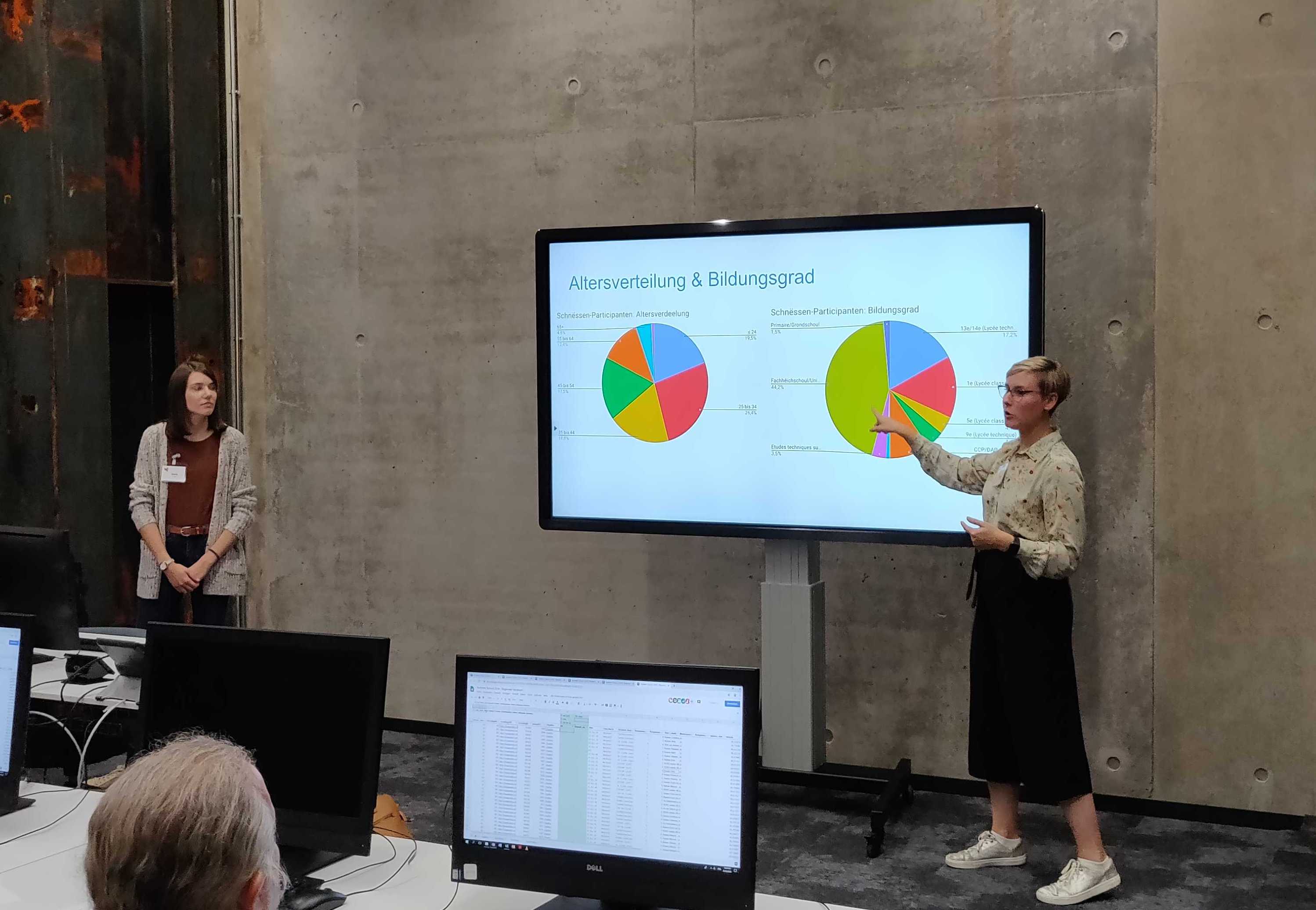 Besonnesch gutt bei de Participante*ën ukomm ass och de Schnëssen-Workshop, bei deem sech een Nomëtte laang alles ëm d’Sproocherhiewungsapp gedréit huet. No eng Presentatioun vun der App selwer, hirem genauen Opbau an enger klenger Auswiel u Resultater konnten d’Participante*ë selwer mat de Schnëssen-Date schaffen. A klenge Gruppe hu si jeeweils dräi bis véier Items ausgewäert, d. h. sech Honnerte vun Opnamen ugelauschtert, Diagrammer erstallt an hir Resultater um Enn vum Workshop kuerz presentéiert.
