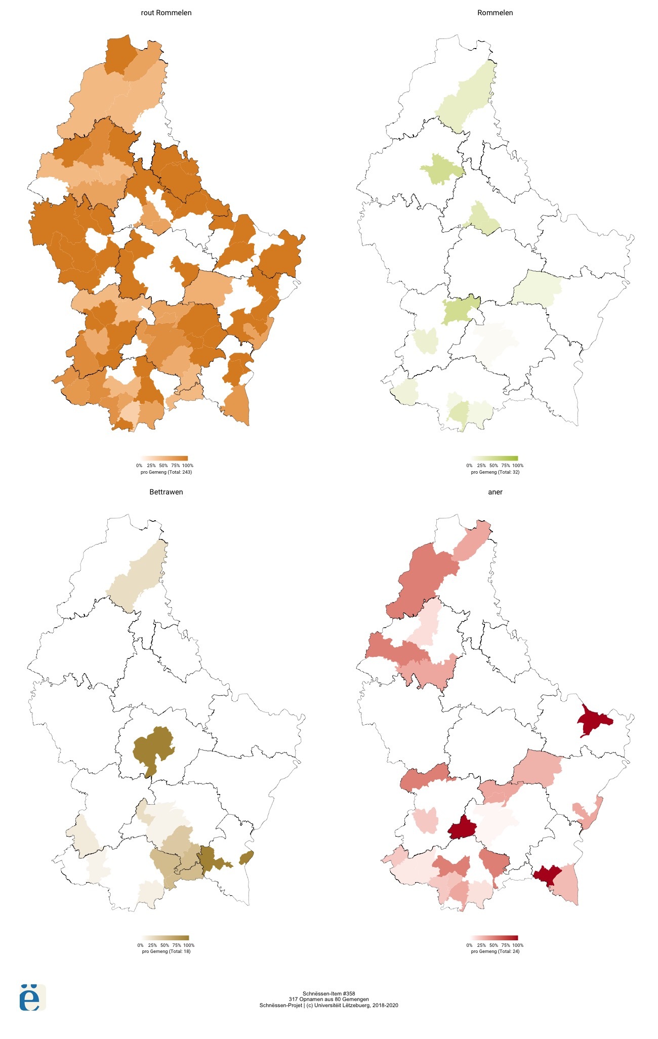 E Bléck op d’Kaart weist eis, datt d‘rout Rommelen an och d‘Rommelen quasi iwwerall am Land beluecht sinn. Eleng d‘Bettrawen schéngen éischter op bestëmmt Regiounen am Süde beschränkt ze sinn. Well dës Variant am Allgemengen allerdéngs zimmlech seele beluecht ass, ass et schwéier aus dëser Visualiséierung Schlëss ze zéien.