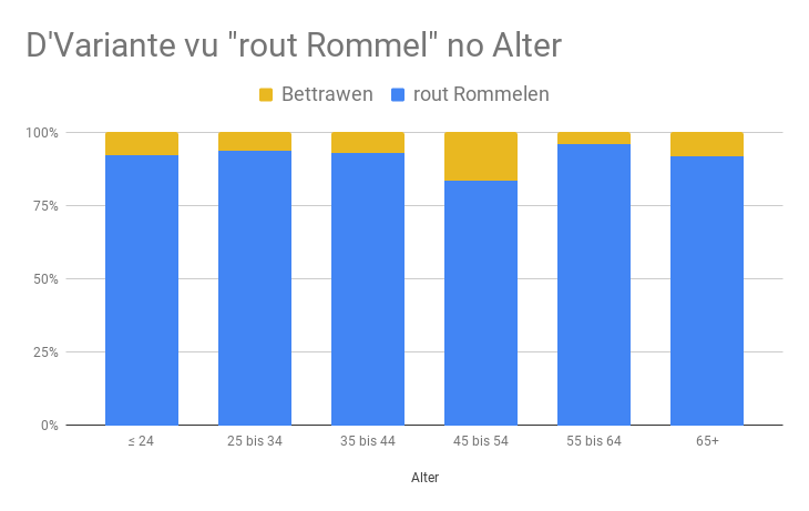 Kucke mer eis als nächst d’Verdeelung vun de Varianten no Alter un. An dësem Diagramm hu mir d’Rommelen bei d’rout Rommelen gerechent, well et sech hei – och wann d’Adjektiv op enger Plaz feelt – u sech ëm déi selwecht Variant handelt an och “aner” vernoléissegt, well et sech hei jo ëm eng Referenz op anert Geméis handelt. Am Diagramm gesäit een op en Neits, datt déi zwou Varianten an all Altersgrupp virkommen an och d’Heefegkeete sech immens änlech sinn. Eleng d’Altersgrupp 45-54 presentéiert sech e bëssen anescht a weist méi Bettrawen-Nennungen op.