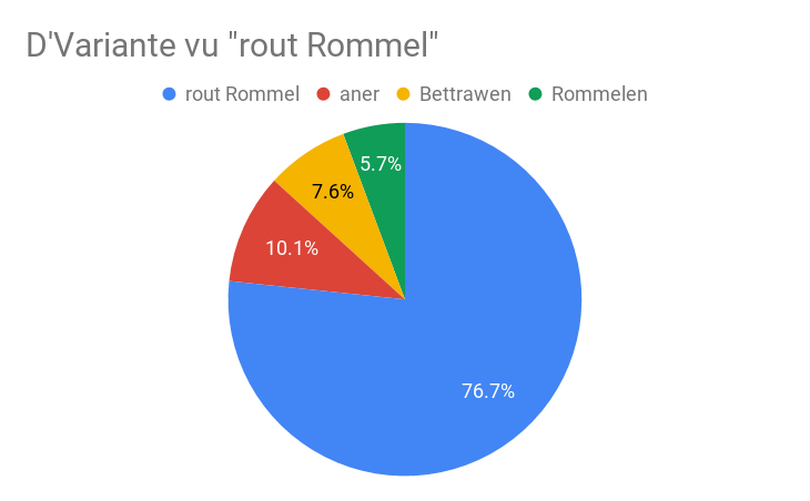 Alles an allem bleift festzehalen, datt mer et hei mat engem Sproochkontaktphenomeen ze dinn hunn, woubäi sech d’Variant rout Rommel kloer als Haaptvariant, déi zudeem iwwerall am Sproochgebitt verbreet ass, erauskristalliséiert huet. D’Resultater weisen awer och, datt trotz de wéinegen Nennungen, d‘Bettrawen an allen Altergsruppen ongeféier d’selwecht dacks beluecht sinn an et soumat keen Hiweis dorop gëtt, datt dës Variant amgaangen ass, ofgebaut ze ginn.
