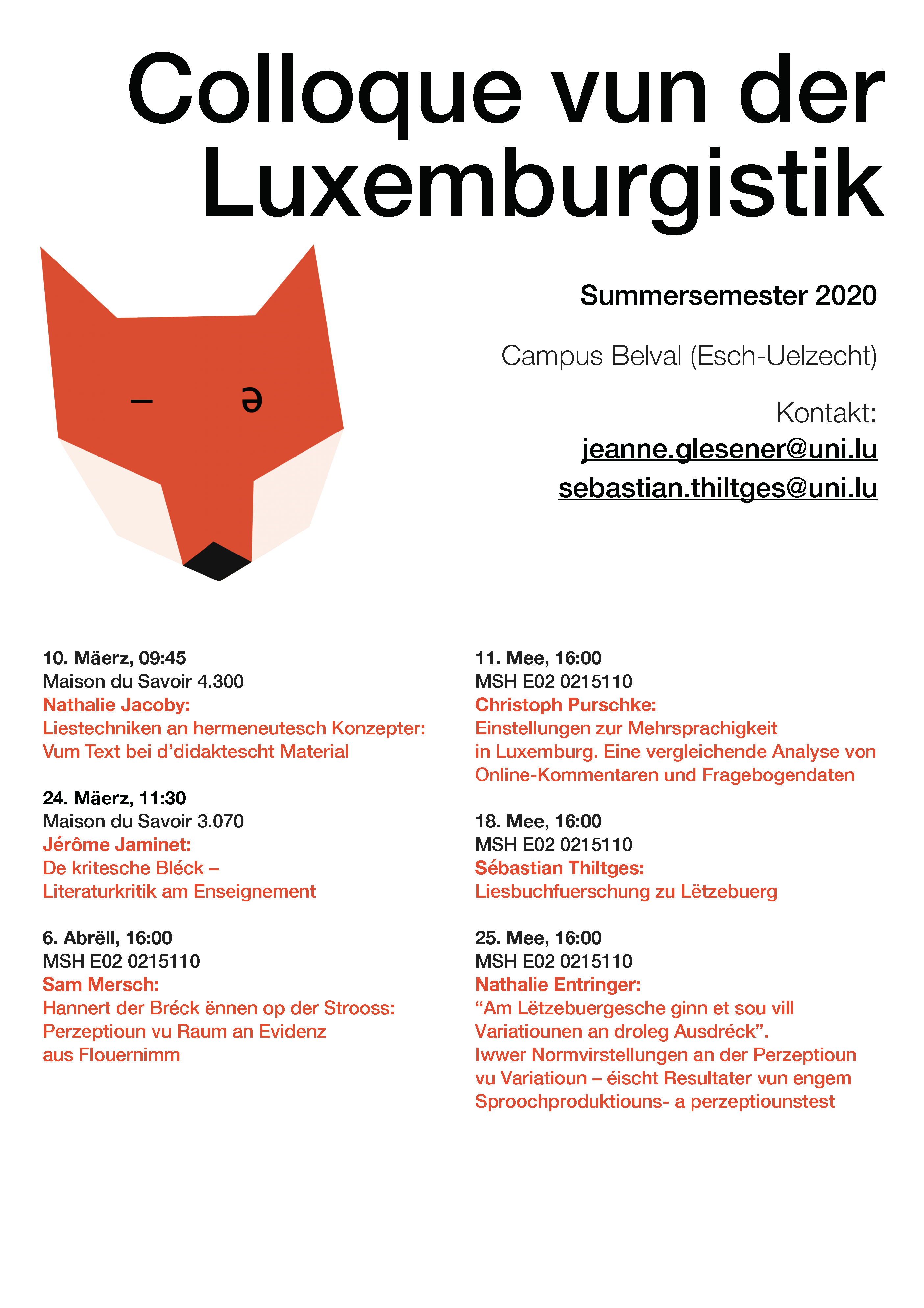 Dir hutt op de genannte Méindeger tëscht 4 a 5 Auer nach näischt vir a sidd interesséiert un eisem Colloque deelzehuelen? Da mellt Iech ënnert dëser E-mail-Adress un: sebastian.thiltges@uni.lu. No der Umeldung, kritt Dir e Link geschéckt, mat deem dir Zougang zu eisem digitale Colloque kritt.