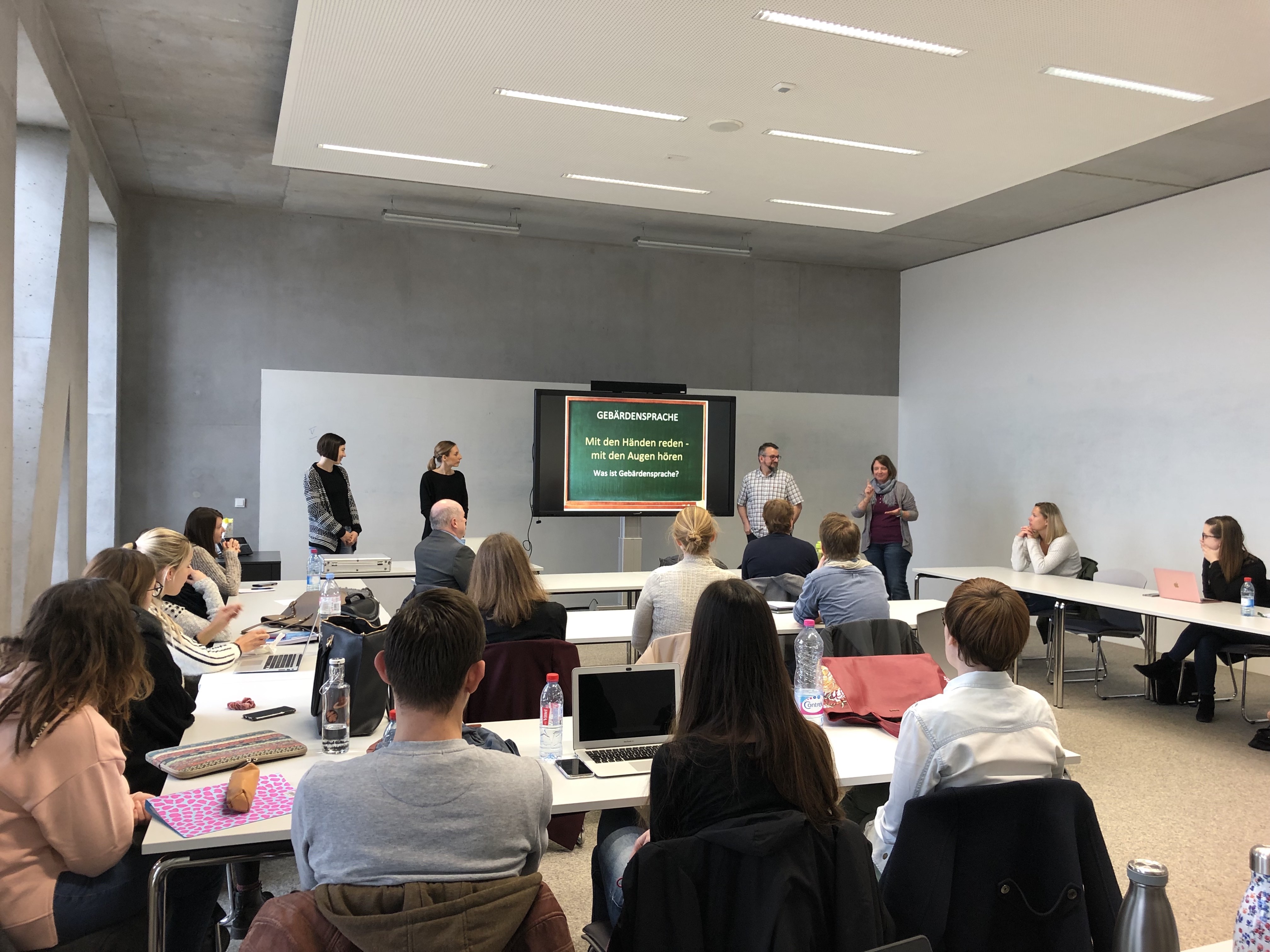 Am Kader vun der Linguistik-Aféierung an eisem Luxemburgistik-Master stoung haut d’Thema Gebäerdesprooch zu Lëtzebuerg um Programm. Dofir waren d’Nicole Sibenaler an de Fabio Giusti vun Daaflux souwéi d’Sabrina Collé an d’Mylène Straus vun der lëtzebuergescher Hörgeschädigten Beratung bei eis op Besuch. Am Virtrag ass et engersäits ëm d’Gebäerdesprooch(en) am Allgemengen, anersäits awer och ëm déi spezifesch Situatioun vu Leit ouni Gehéier zu Lëtzebuerg gaangen. Doriwwer eraus gouf et och e flotten Austausch tëscht eise Gäscht an den interesséierte Leit am Publikum. De Virtrag an d’Diskussioun goufe vun enger Dolmetscherin vun der Däitscher Gebäerdesprooch (DGS) an d’Däitscht iwwersat.
