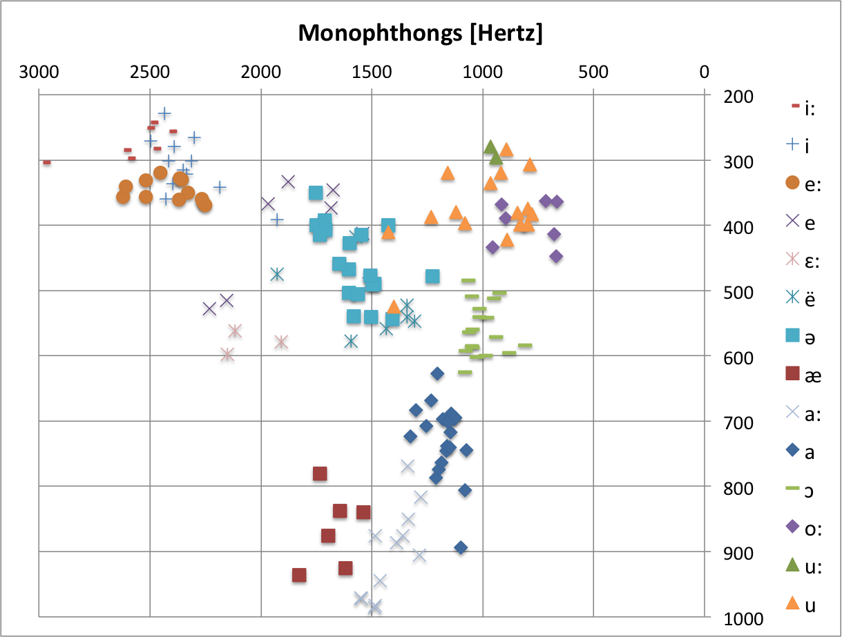 Die folgende Abbildung zeigt das Monophthongsystem eines jungen Sprechers von heute. Dargestellt sind hier keine Mittelwerte sondern die Messwerte der einzelen Vokalrealisierungen, die dann als Wolken von Symbolen erscheinen. So werden die kontextuell bedingten Streubereiche der Realisierungen sichtbar. Im Vergleich zur Untersuchung von 1976 sind folgende Beobachtungen wichtig: