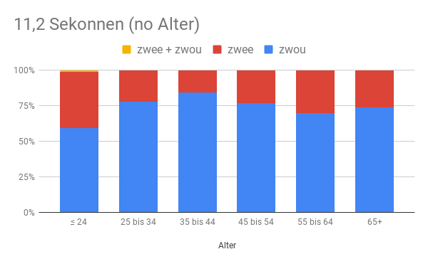 Mat Bléck op den Alter ass zwar kee ganz kloert Bild – sou wéi mer et scho mol bei anere Resultater gesinn hunn – ze erkennen, mee trotzdeem gëtt ersiichtlech, dass déi jéngst Spriecher*innen zwee méi dacks benotzt hu wéi déi an deenen aneren Altersgruppen. Wärend den zwee-Prozentsaz meeschtens graff tëscht 15 an 30% läit, ass e bei deene Jéngste bei ëmmerhin 39%.